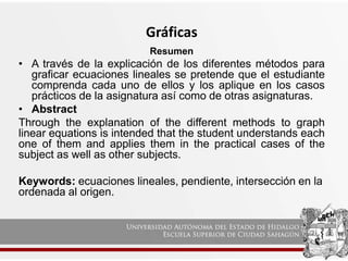 Este documento explica tres métodos para graficar ecuaciones lineales: el método de tabulación, el método de pendiente-intersección, y el método de intersección con los ejes. El objetivo es que los estudiantes comprendan cada método y puedan aplicarlos para graficar ecuaciones lineales tanto en esta asignatura como en otras.