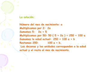 El documento presenta diferentes trucos y enigmas matemáticos basados en propiedades como la paridad, los múltiplos de 9, las progresiones aritméticas y las potencias de 2. Incluye ejemplos de trucos con cartas, dados y calendarios donde se utilizan estas propiedades para predecir resultados.