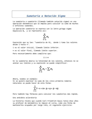 1) La sumatoria o notación sigma se usa para calcular la suma de muchos o infinitos sumandos. 2) Se representa con la letra griega mayúscula Σ y expresa la suma desde un límite inferior hasta un límite superior. 3) Existen fórmulas para calcular sumatorias de forma más rápida, como la suma de los n primeros números naturales.