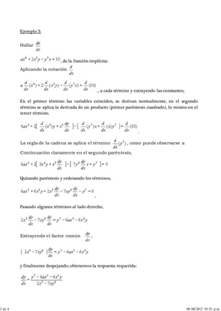 Este documento explica cómo derivar funciones implícitas utilizando la regla de la cadena o derivadas parciales. Presenta dos métodos para derivar funciones implícitas definidas por ecuaciones: 1) aplicando la regla de la cadena a cada término que involucre a la variable y, o 2) usando la fórmula que involucra derivadas parciales de la función con respecto a x e y. El documento provee ejemplos de cómo aplicar ambos métodos y concluye indicando que las derivadas parciales pueden simplificar el pro