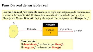Este documento trata sobre funciones reales de variable real. Explica que una función real asigna a cada número real de un subconjunto del dominio otro número real único. Define dominio como el subconjunto de entrada y rango como el subconjunto de salida. Presenta ejemplos para ilustrar cómo calcular el dominio, rango y gráfica de funciones. También cubre clasificación de funciones, operaciones como adición y composición de funciones.
