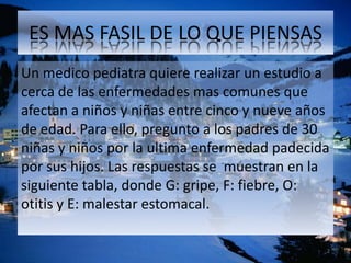 El documento describe un estudio sobre las enfermedades más comunes en niños entre 5 y 9 años. Se recolectaron datos de 30 niños sobre su última enfermedad (gripe, fiebre, otitis o malestar estomacal). Se construyó una tabla de frecuencias con 4 intervalos correspondientes a cada enfermedad y sus respectivas frecuencias. La enfermedad más frecuente fue la gripe con 11 casos.