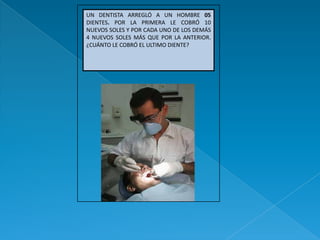 El dentista cobró 10 nuevos soles por el primer diente, y cobró 4 nuevos soles más por cada diente subsiguiente. Siguiendo una progresión aritmética, cobró 14 nuevos soles por el último diente.