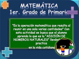 El documento presenta ejemplos de sumas y restas de números naturales, incluyendo 1 + 1 = 2, 4 + = 8, + 6 = 9, 4 2 = 6, 8 + = 9, + 5 = 7. También incluye instrucciones para completar operaciones aritméticas en una tabla colocando el número correcto que hace falta.