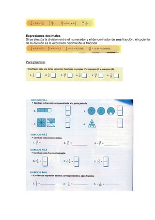 Este documento describe las fracciones y expresiones decimales. Explica que los números racionales pueden expresarse como fracciones o decimales. Las fracciones se clasifican en propias, impropias y aparentes. Las fracciones impropias pueden escribirse como números mixtos. Las expresiones decimales se obtienen al dividir el numerador y denominador de una fracción.
