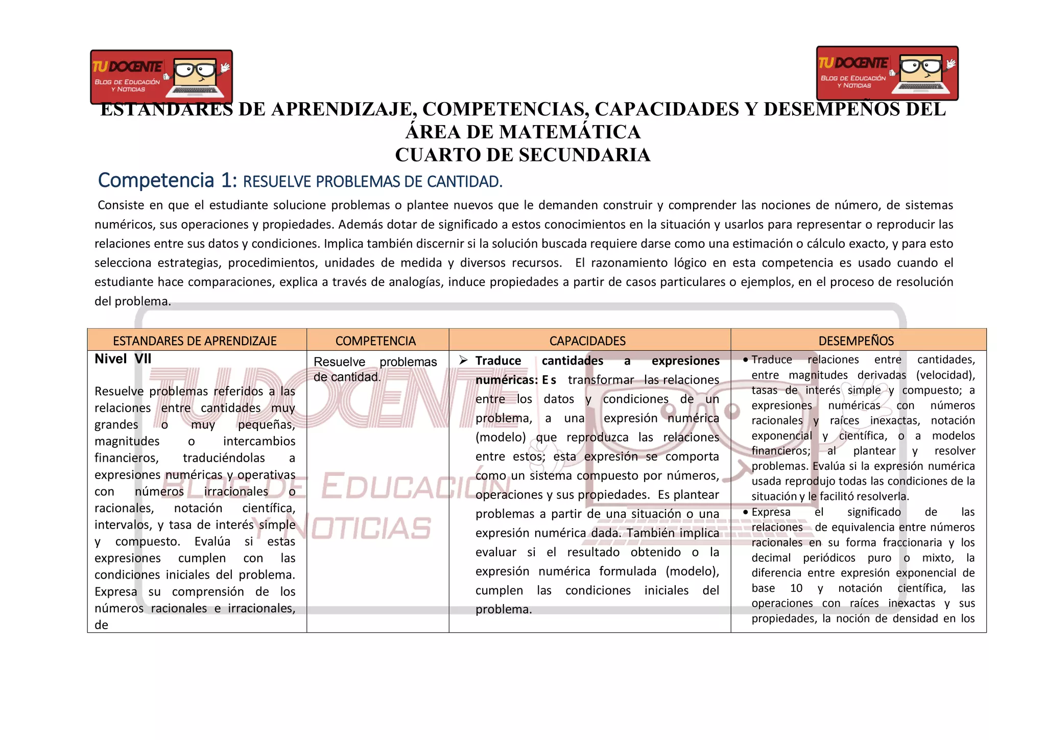 1) El documento presenta los estándares de aprendizaje, competencias, capacidades y desempeños del área de matemáticas para cuarto año de secundaria. 2) La primera competencia es resolver problemas de cantidad y la segunda es resolver problemas de regularidad, equivalencia y cambio. 3) Cada competencia describe las capacidades y desempeños que los estudiantes deben lograr en términos de resolver problemas relacionados a números, expresiones algebraicas y funciones.