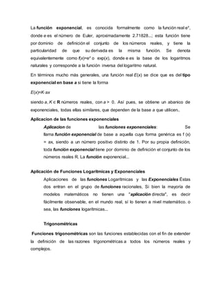La función exponencial es aquella cuya derivada es la misma función y tiene por dominio los números reales. Las funciones exponenciales, logarítmicas, trigonométricas y hiperbólicas son importantes en matemáticas y tienen aplicaciones en diversas áreas. Slideshare permite compartir presentaciones en línea de manera gratuita.
