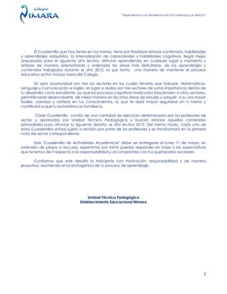 Este documento presenta un cuadernillo de refuerzo de matemáticas para sexto básico. Explica que el objetivo es reforzar contenidos y habilidades adquiridas en matemáticas, lenguaje y comunicación e inglés. Los estudiantes deberán trabajar en tres sectores y el cuadernillo será revisado por los profesores y constituirá la primera nota del sector. El cuadernillo debe ser entregado el 11 de marzo sin excusas.