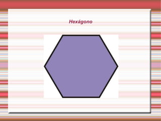 El documento describe las propiedades de un hexágono regular, incluyendo que tiene seis lados y ángulos iguales de 120 grados, nueve diagonales, y que su perímetro y área pueden calcularse a partir de la longitud de sus lados y apotema.