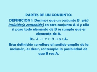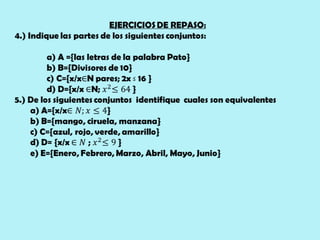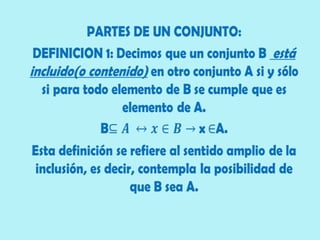 Este documento presenta conceptos básicos de la teoría de conjuntos. Explica que un conjunto es una colección de objetos y que puede definirse mediante descripción verbal, lista de elementos o comprensión. También define subconjuntos, conjuntos iguales, vacíos, finitos e infinitos.