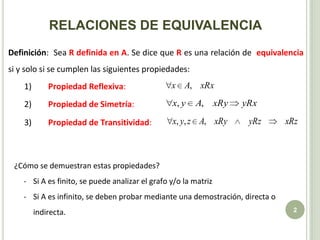 El documento trata sobre relaciones en matemáticas discretas, enfocándose en relaciones de equivalencia y sus propiedades: reflexividad, simetría y transitividad. Además, incluye ejemplos, ejercicios y definiciones relacionadas con clases de equivalencia y particiones. Se destacan ejercicios prácticos para aplicar estos conceptos a grafos y diagramas de Venn.