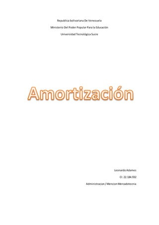 El documento presenta dos ejercicios de cálculo de intereses y amortización de deudas. El primer ejercicio calcula los pagos y tabla de amortización para saldar una deuda de Bs. 4.800.000 a pagar en un año en cuatro pagos trimestrales al 30% anual. El segundo ejercicio calcula los pagos mensuales para saldar una deuda de Bs. 1.800.000 a pagar en 12 meses con interés del 18% mensual. Ambos ejercicios presentan la fórmula utilizada, los datos y la