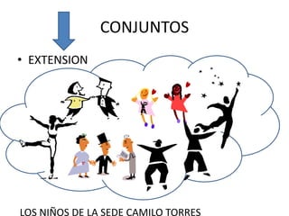 El documento presenta conceptos básicos de conjuntos matemáticos como pertenencia, no pertenencia, conjuntos iguales, conjuntos vacíos, conjuntos disyuntos y el conjunto universal. Explica estos conceptos a través de ejemplos con letras y nombres para mostrar las relaciones entre los elementos de diferentes conjuntos.