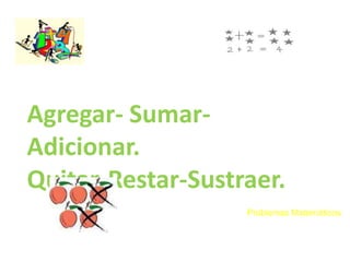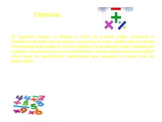 Este documento introduce la suma y la resta a niños de primaria. Explica que la suma es la adición de dos o más números, mientras que la resta es quitar o sustraer elementos de un conjunto. Proporciona ejemplos sencillos de problemas de suma y resta para motivar a los estudiantes sobre la importancia de estas operaciones básicas en la vida diaria y en matemáticas más avanzadas.