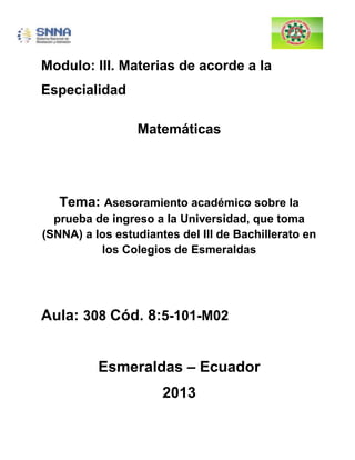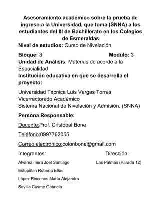 Este documento presenta un proyecto para brindar asesoramiento académico a estudiantes de tercer año de bachillerato sobre la prueba de ingreso a la universidad administrada por el SNNA. El proyecto analiza la problemática de la baja preparación de los estudiantes, establece objetivos como elaborar material informativo y visitar colegios para dar charlas, y describe aspectos como el marco teórico, cronograma y presupuesto. El resumen concluye que el proyecto busca orientar a los estudiantes para que ob