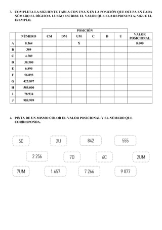 Este documento presenta una guía de matemáticas de 4o básico sobre el valor posicional. La guía contiene ejercicios para que los estudiantes practiquen la representación y comprensión del sistema de numeración decimal a través de ejercicios de escritura, lectura, representación gráfica y tabla de números hasta las decenas de miles. Los estudiantes deben identificar el valor que representa cada dígito en números dados, colorear el valor posicional correspondiente a cada dígito, completar tablas con la posición y valor de dí