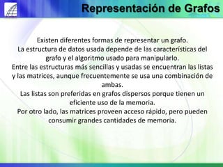 El documento describe diferentes formas de representar grafos, incluyendo estructuras de lista y matrices. Las listas son preferidas para grafos dispersos debido a un uso eficiente de la memoria, mientras que las matrices permiten un acceso rápido pero pueden requerir más memoria. Se detallan específicamente las listas de incidencia, adyacencia y grados, así como las matrices de adyacencia y incidencia para representar grafos.