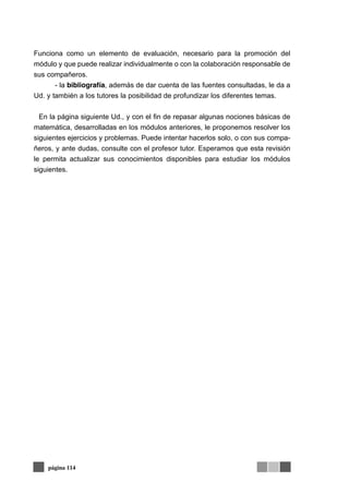 El documento describe la organización de los módulos de matemática. Cada módulo contiene lecciones organizadas por temas principales. Cada lección incluye secciones como problemas, soluciones propias, soluciones propuestas, actividades y claves de corrección. Al final del módulo hay un trabajo práctico integrador y bibliografía.