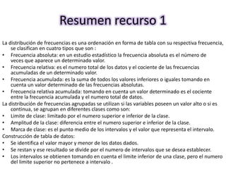 El documento describe diferentes tipos de distribuciones de frecuencias y representaciones gráficas de datos. Explica cuatro tipos de distribuciones de frecuencias - frecuencia absoluta, frecuencia relativa, frecuencia acumulada y frecuencia relativa acumulada. También describe diferentes tipos de gráficos como gráficos de sectores, gráficos de barras, histogramas de frecuencias y polígonos de frecuencias que pueden usarse para representar datos estadísticos de manera visual.
