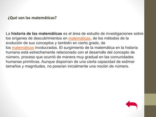 El documento trata sobre la historia de las matemáticas. Explica que la historia de las matemáticas estudia el origen de los descubrimientos matemáticos, la evolución de sus conceptos y los matemáticos involucrados. Además, señala que el surgimiento de las matemáticas en la historia humana estuvo estrechamente relacionado con el desarrollo del concepto de número de forma gradual en las comunidades humanas primitivas, aunque inicialmente no tenían una noción de número sino solo una capacidad de estimar