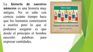 Este documento presenta una introducción a los diferentes tipos de números. Define números enteros positivos, valor absoluto, números opuestos y números reales negativos. También explica la representación de los números enteros en una línea numérica y la historia temprana del desarrollo de los números naturales por los humanos antes de la aparición de un sistema numérico formal.