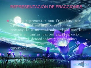 El documento trata sobre las fracciones. Explica cómo se pueden representar fracciones usando figuras geométricas divididas en partes iguales. También cubre temas como determinar si dos fracciones son equivalentes, cómo realizar operaciones con fracciones como suma y resta, la representación de los números enteros en una recta numérica, y las diferentes clases de fracciones como fracciones propias e impropias. El documento concluye con una actividad de ejemplo y una sección de bibliografía y glosario.