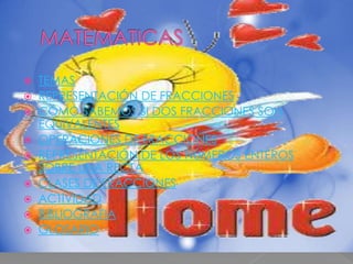 Este documento trata sobre las fracciones y contiene secciones sobre cómo representar fracciones, determinar si dos fracciones son equivalentes, operaciones con fracciones, números enteros en una recta numérica, tipos de fracciones, un ejemplo de fracciones, bibliografía y glosario. Explica cómo representar fracciones usando figuras divididas y cómo sumar y restar fracciones con igual o diferente denominador siguiendo unas reglas.