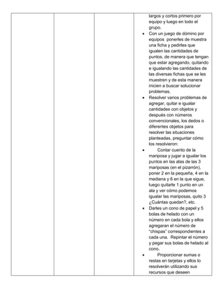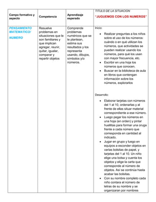 Este documento describe una situación de aprendizaje sobre los números. A lo largo de 8 días, los estudiantes participarán en varias actividades prácticas como contar objetos, ordenar números, resolver problemas matemáticos y jugar con dominós y una tienda de juguete para reforzar su comprensión de conceptos numéricos como agregar, quitar, igualar y contar. Al final, se evaluará si los estudiantes han mejorado su conocimiento y uso de los números.