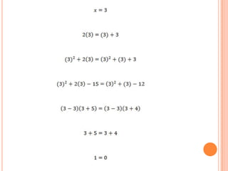 Este documento presenta un problema matemático falaz que intenta demostrar que 1 es igual a 0 a través de una serie de pasos algebraicos. Sin embargo, al sustituir valores y aplicar propiedades matemáticas como la ley de sustitución y las propiedades de igualdad, se demuestra que el quinto paso del problema no es válido, rompiendo la igualdad y revelando el error en la demostración planteada.