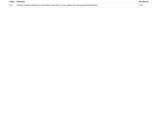 Este documento presenta los estándares de evaluación en matemáticas para un estudiante de 3er grado. Cubre estándares relacionados con números enteros, operaciones aritméticas, unidades de medida de tiempo y dinero, y conceptos geométricos básicos como poliedros y cuerpos redondos. El documento lista cada estándar con su código correspondiente y el valor máximo posible de puntuación.