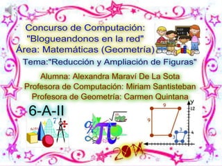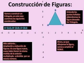 El documento describe cómo construir un triángulo usando coordenadas de puntos y luego ampliarlo el doble multiplicando las coordenadas por 2. También explica cómo reducir una figura "S" dividiendo las coordenadas entre 2 para obtener una figura "T".