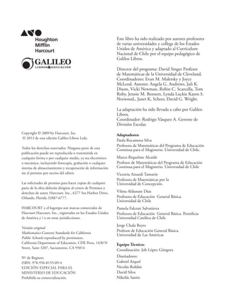 Este documento presenta un cuaderno de práctica para el sexto grado de matemáticas básicas. Incluye ejercicios sobre números, fracciones, porcentajes, álgebra, geometría y estadística. El cuaderno fue adaptado para el currículum chileno por un equipo de profesores de varias universidades chilenas. Fue publicado por Galileo Libros y contiene derechos de autor.