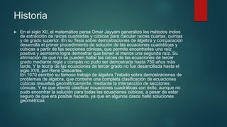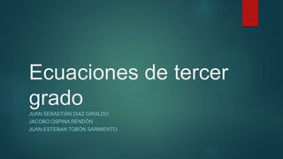 Este documento resume la historia y definición de las ecuaciones de tercer grado. Explica que el matemático persa Omar Jayyam generalizó los métodos para calcular raíces cúbicas y de grado superior en el siglo XII, aunque no se pudo demostrar que no se pueden hallar las raíces de ecuaciones de tercer grado mediante regla y compás hasta 750 años después. Define una ecuación de tercer grado como una función cuyo mayor exponente es tres, y ofrece un ejemplo de una función cúbica. Final