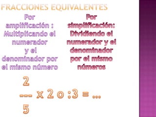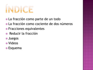 Este documento trata sobre las fracciones y contiene secciones sobre la fracción como parte de un todo, como cociente de dos números, fracciones equivalentes, cómo reducir fracciones, juegos y videos interactivos sobre fracciones, y un esquema sobre el tema. Explica cómo calcular el valor de una fracción al dividir el numerador entre el denominador y cómo convertir fracciones a un denominador común para simplificarlas.