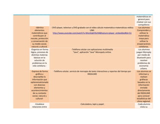 Este documento describe varios recursos y actividades para enseñar matemáticas a estudiantes relacionando conceptos matemáticos con el contexto natural, social y cultural de la comunidad. Los estudiantes usarán computadoras, teléfonos celulares, aplicaciones y juegos para desarrollar su pensamiento lógico y resolver problemas utilizando símbolos, algoritmos y términos matemáticos. También aprenderán sobre sistemas de medición regionales y estadísticas climáticas, y establecerán conexiones entre los conocim
