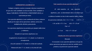 El documento aborda las expresiones algebraicas, definiendo conceptos como variables, monomios, binomios, trinomios y polinomios, y cómo se utilizan para resolver problemas matemáticos prácticos, como el cálculo de áreas y volúmenes. También se explican operaciones básicas con estas expresiones, así como la forma de calcular su valor numérico, clasificación y suma de polinomios. Además, se incluyen identidades notables y simplificación de fracciones algebraicas.