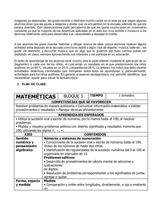 El documento describe el contexto y diagnóstico de una escuela primaria en Mazatlán, Sinaloa. La escuela está ubicada en una zona urbana de clase media-baja con problemas como drogadicción y pandillerismo. La escuela tiene 445 estudiantes y sus instalaciones son antiguas pero en buen estado. El diagnóstico del grupo de primer grado muestra que los 22 estudiantes disfrutan de actividades como dibujar y cantar, y que su estilo de aprendizaje es principalmente auditivo y visual.