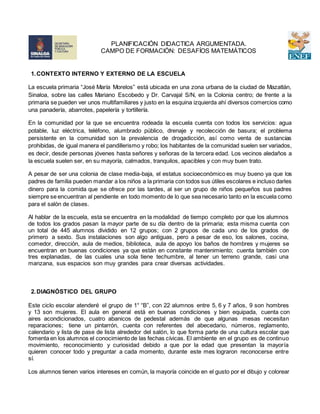 El documento describe el contexto y diagnóstico de una escuela primaria en Mazatlán, Sinaloa. La escuela está ubicada en una zona urbana de clase media-baja con 445 estudiantes. El diagnóstico encontró que la mayoría de los estudiantes son auditivos y les gusta cantar, dibujar e inventar historias. El plan de clases propone actividades matemáticas para desarrollar habilidades numéricas como contar, sumar y restar hasta 100.