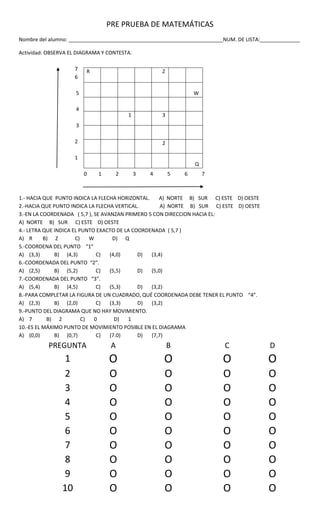 Este documento contiene 20 preguntas de matemáticas para una prueba previa. Las preguntas cubren una variedad de temas matemáticos como geometría, números decimales, operaciones aritméticas, fracciones y más. Cada pregunta presenta cuatro opciones de respuesta de las cuales el estudiante debe seleccionar la correcta.