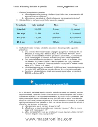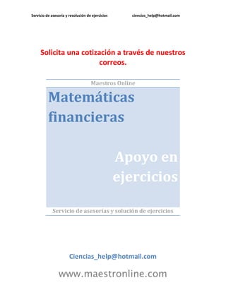 Este documento ofrece servicios de asesoría y resolución de ejercicios relacionados con las ciencias financieras. Incluye varios ejercicios de matemáticas financieras sobre temas como intereses simples y compuestos, tasas de interés, descuentos, anualidades y amortización de deudas. El documento proporciona información de contacto para solicitar cotizaciones y ofrece apoyo en la solución de ejercicios sobre estas materias.