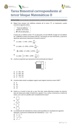 Este documento presenta 20 preguntas de matemáticas sobre temas como porcentajes, álgebra, geometría y estadística. Los estudiantes deben mostrar sus respuestas y razonamientos en hojas aparte y entregarlas antes del 21 de febrero de 2013.
