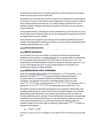 El diferencial representa el cambio linealizado de una función con respecto a cambios en la variable independiente. Puede definirse como la derivada multiplicada por un pequeño cambio en la variable, o como una forma diferencial que toma un significado geométrico o analítico dependiendo del contexto. Para funciones de múltiples variables, el concepto se generaliza usando la matriz jacobiana.