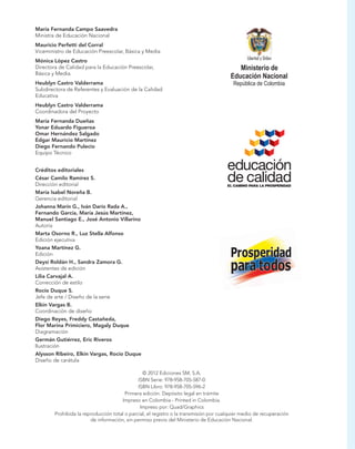 El documento presenta el Programa de Transformación de la Calidad Educativa del Ministerio de Educación Nacional de Colombia. Este programa busca mejorar la calidad de la educación en el país a través de recursos como libros de matemáticas. El documento incluye los créditos de las personas involucradas en la creación del libro y su publicación.