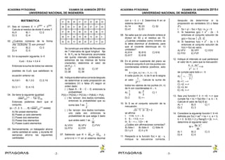 El documento presenta un examen de admisión a la universidad con 33 preguntas de matemáticas. Las preguntas abarcan temas como números, álgebra, funciones, geometría y probabilidad. El examen evalúa las habilidades matemáticas básicas y el razonamiento lógico necesarios para ingresar a carreras de ingeniería.