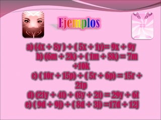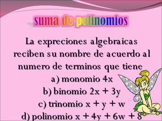El documento habla sobre las expresiones algebraicas. Define los diferentes tipos de expresiones como monomios, binomios, trinomios y polinomios según el número de términos que contienen. Explica que cada signo de más o menos separa un término del siguiente y que el signo a la izquierda de cada término indica su signo. También menciona que un número y una letra juntos significan que están siendo multiplicados.