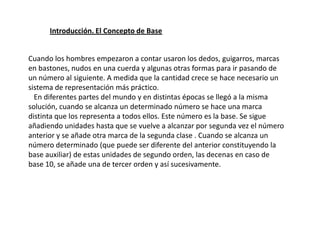 Este documento describe varios sistemas de numeración antiguos, incluyendo los sistemas egipcio, griego, chino, babilónico y maya. Explica que los primeros sistemas eran aditivos, donde los símbolos se acumulaban para representar cada número, mientras que los sistemas posicionales más avanzados como el indio utilizaban la posición de cada símbolo para representar unidades, decenas, centenas y así sucesivamente. Finalmente, señala que aunque nuestro sistema numérico actual se conoce como arábig