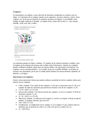 Este documento presenta conceptos básicos sobre conjuntos y números reales. Define un conjunto como una colección de elementos y describe operaciones básicas como unión, intersección y diferencia. Explica que los números reales incluyen números naturales, enteros y decimales entre los infinitos extremos. Finalmente, introduce desigualdades y el valor absoluto, indicando que una desigualdad de valor absoluto tiene dos casos a considerar.