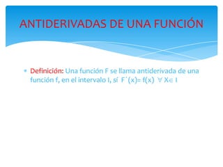 Este documento trata sobre las antiderivadas y las integrales indefinidas. Explica que si F(x) es una antiderivada de una función f(x), entonces F(x)+c también lo es para cualquier constante c. También cubre reglas como que la suma de antiderivadas es la antiderivada de la suma, y que si f es constante, entonces su antiderivada también lo es. Finalmente, define la integral indefinida como el conjunto de todas las antiderivadas de una función f(x).