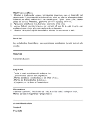 El documento describe un programa de matemáticas interactivas que utiliza herramientas educativas como Gcompris. El objetivo es mejorar el aprendizaje de conceptos matemáticos como suma, resta y multiplicación a través de actividades lúdicas con tecnología para estudiantes de primaria. Los docentes incluirán estas actividades en su planificación trimestral y las desarrollarán de forma simultánea en todas las aulas de un estado.
