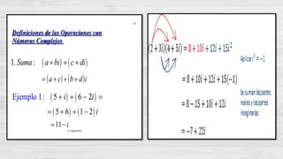 Los números complejos surgen de la necesidad de resolver ecuaciones cúbicas y cuadráticas. Representan la suma de un número real y uno imaginario. Existen varias formas de representarlos como binómica, polar, exponencial y trigonométrica. Los números complejos forman un cuerpo y permiten resolver ecuaciones que de otro modo no tendrían solución en los reales.